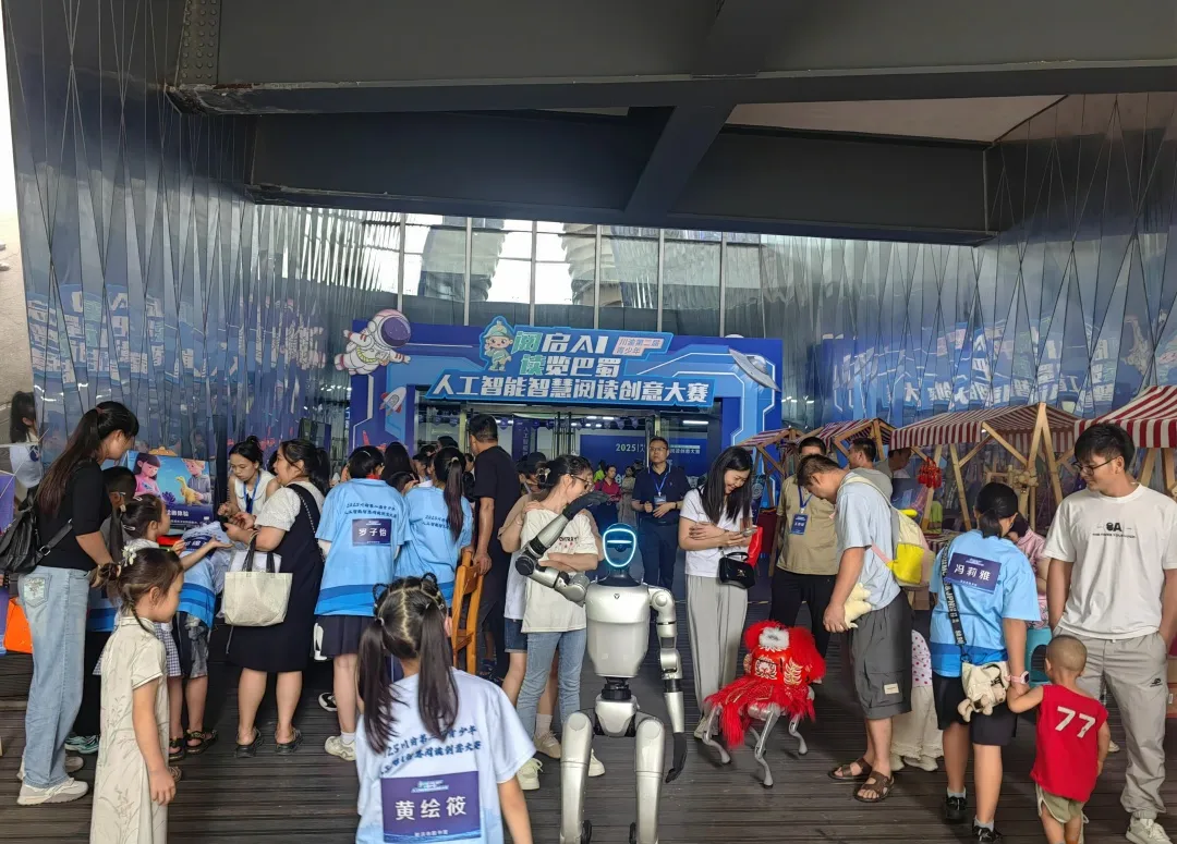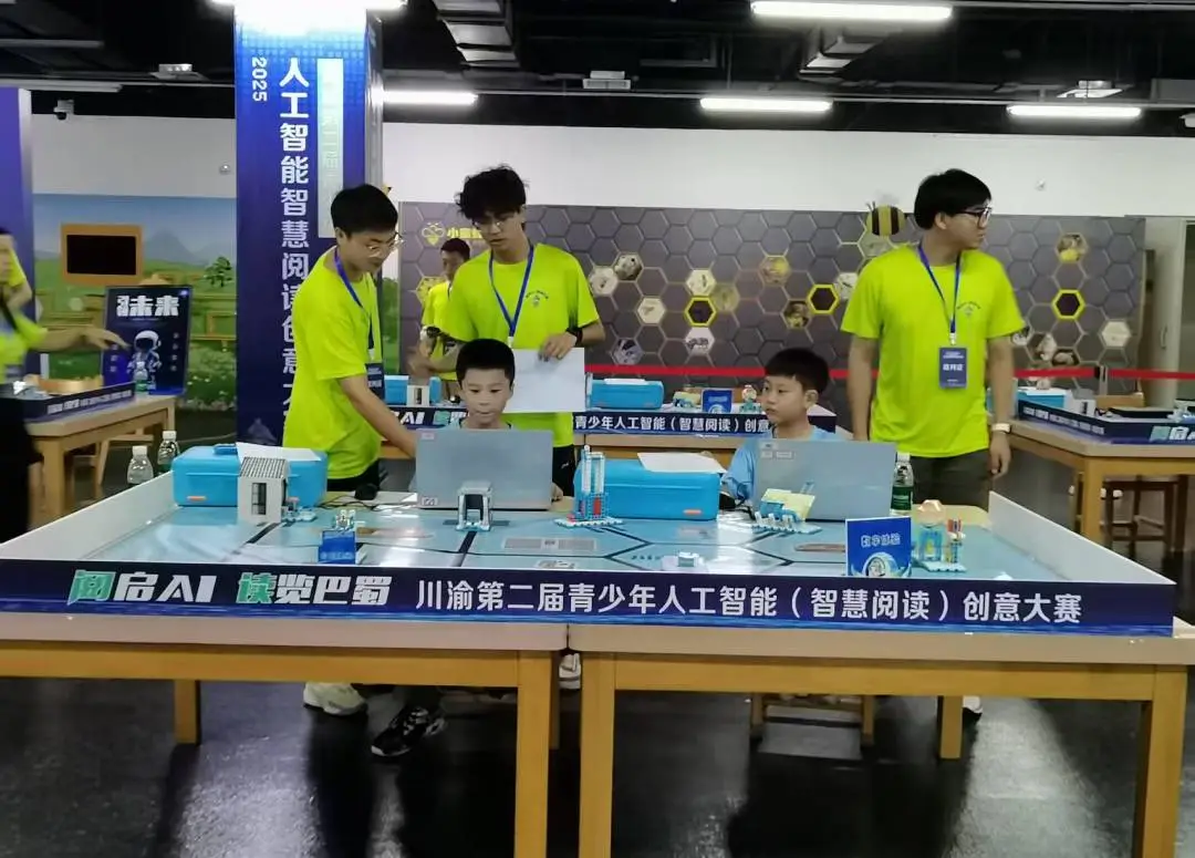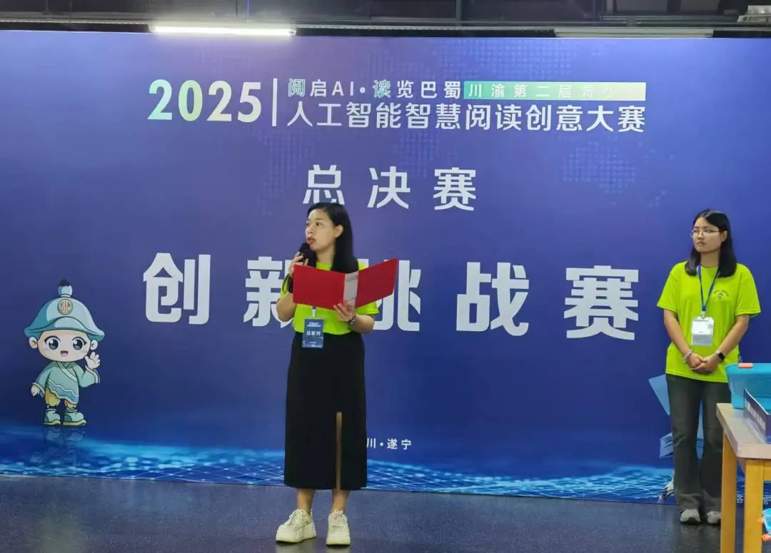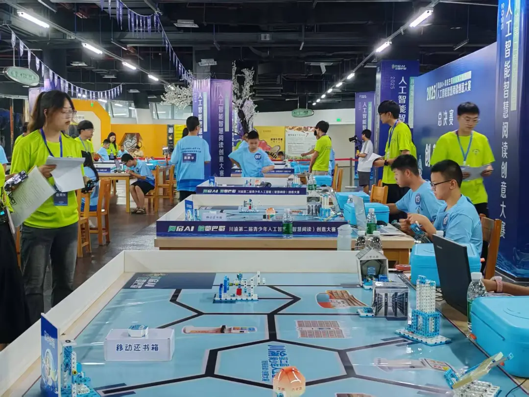 近日,由四川省图书馆、重庆图书馆、遂宁市文化广播电视体育和旅游局携手二十余家市县图书馆联合主办的“2025川渝第二届青少年人工智(智慧阅读)创意大赛”总决赛在遂宁市文化中心成功举行!来自川渝地区的82名青少年科技精英汇聚一堂,展开智慧与创新的终极较量。本次大赛以“阅启AI,读览巴蜀”为主题,聚焦人工智能与阅读场景的融合创新,为8至13岁青少年提供展示科技创意与实践能力的舞台。